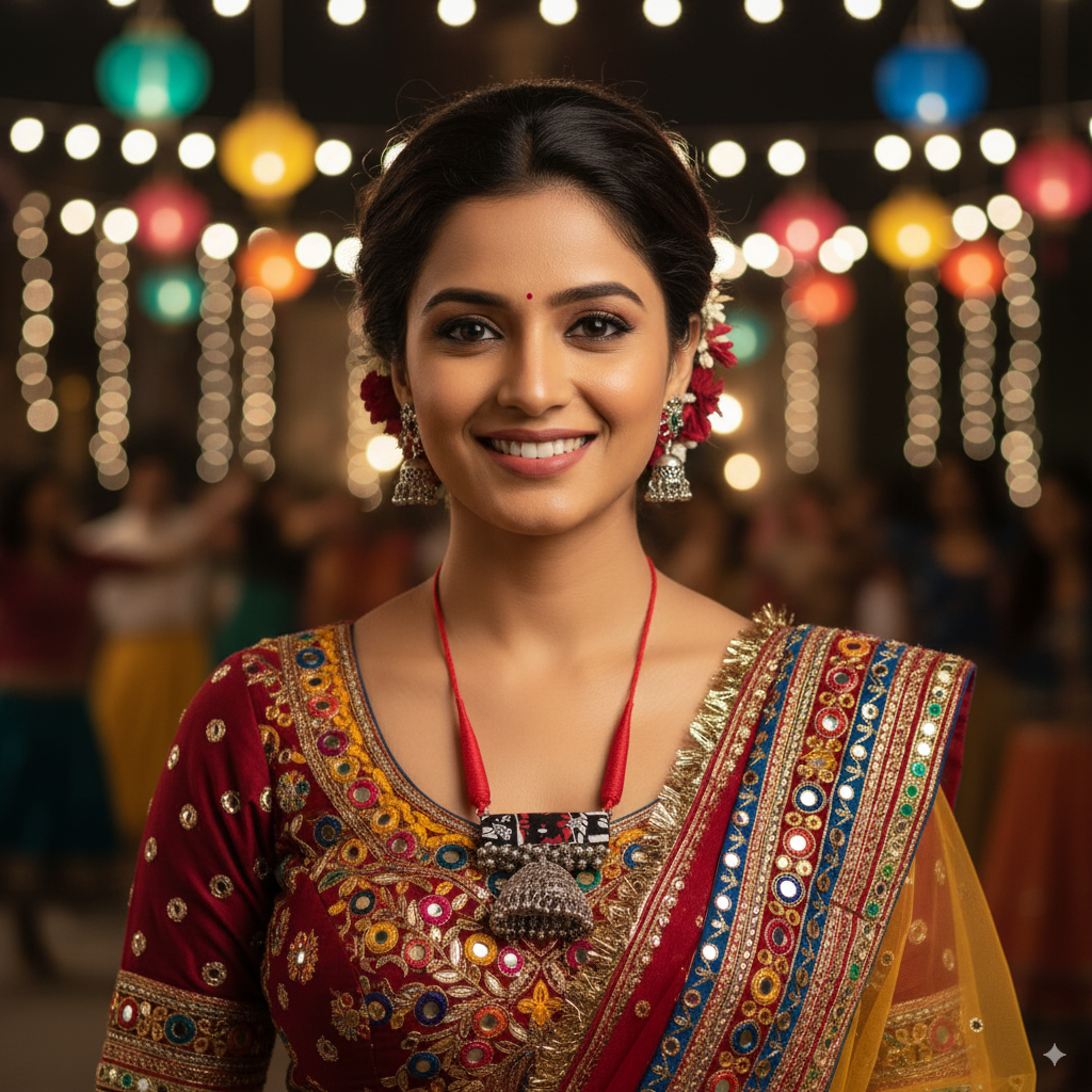 These elegant earrings feature a crescent-shaped design crafted from vibrant, patterned fabric in black, red, and white hues. Each earring is adorned with a delicate metallic leaf charm and a dangling jhumka element, consisting of a metallic bell-shaped cap with intricate detailing and small hanging beads. The combination of traditional fabric work and metallic accents creates a unique, stylish accessory suitable for various occasions.