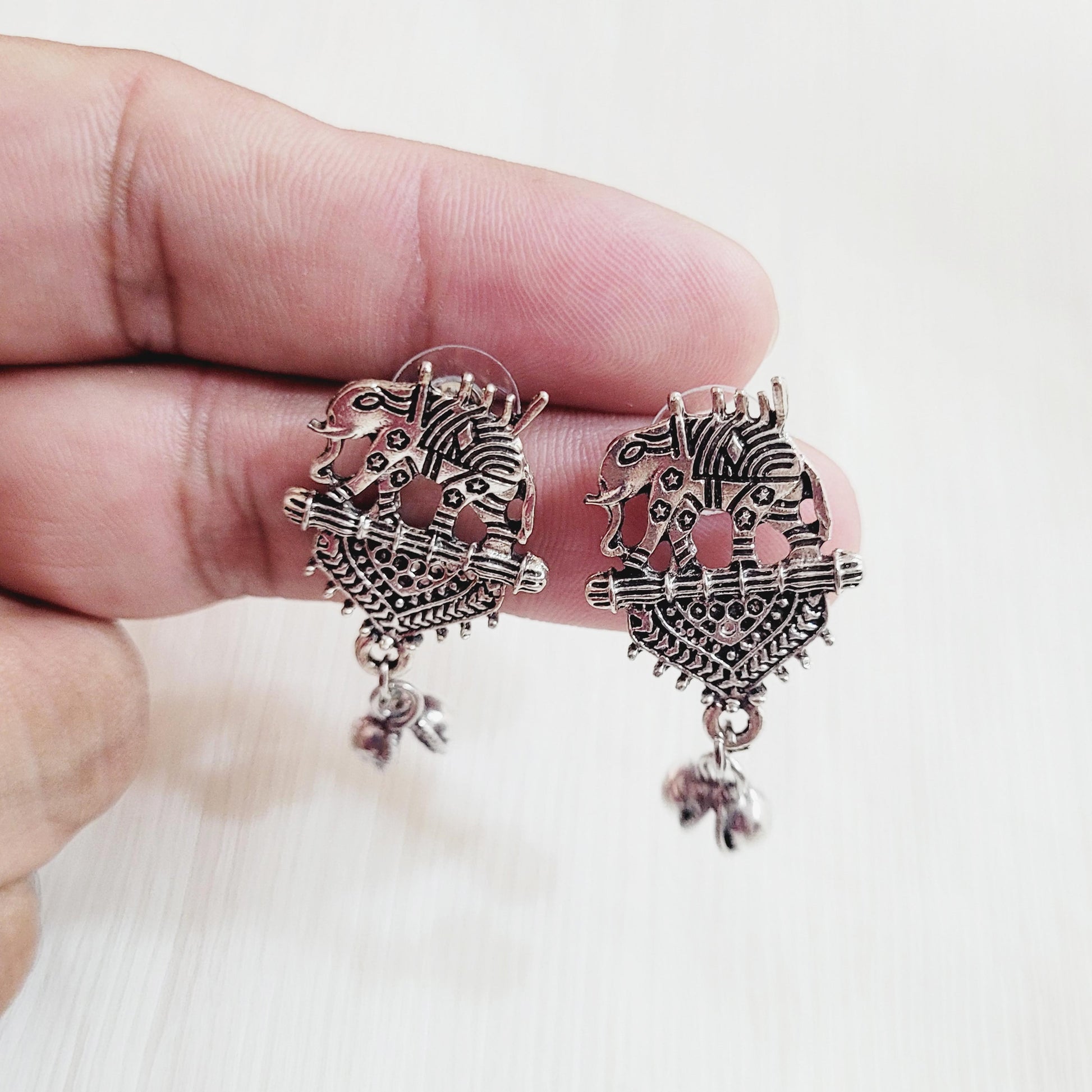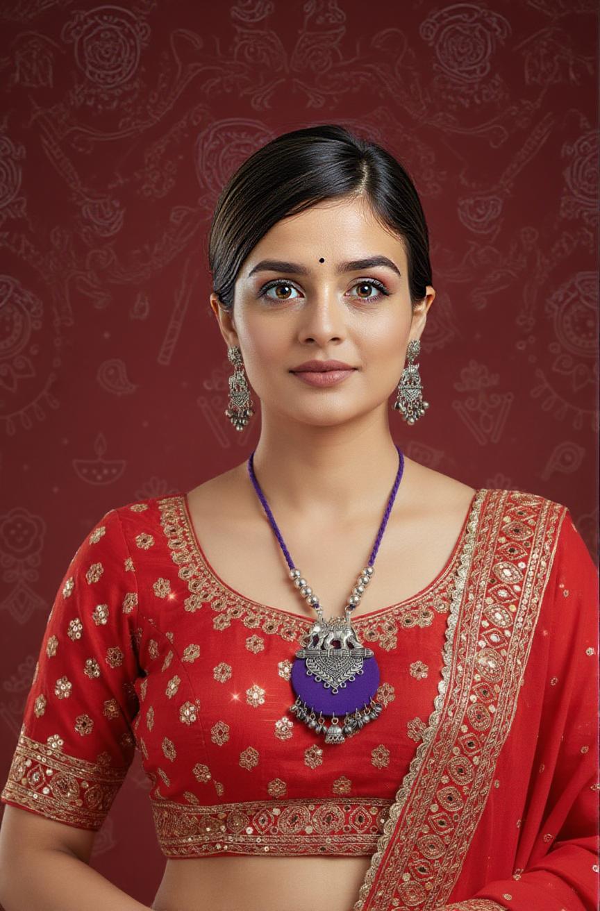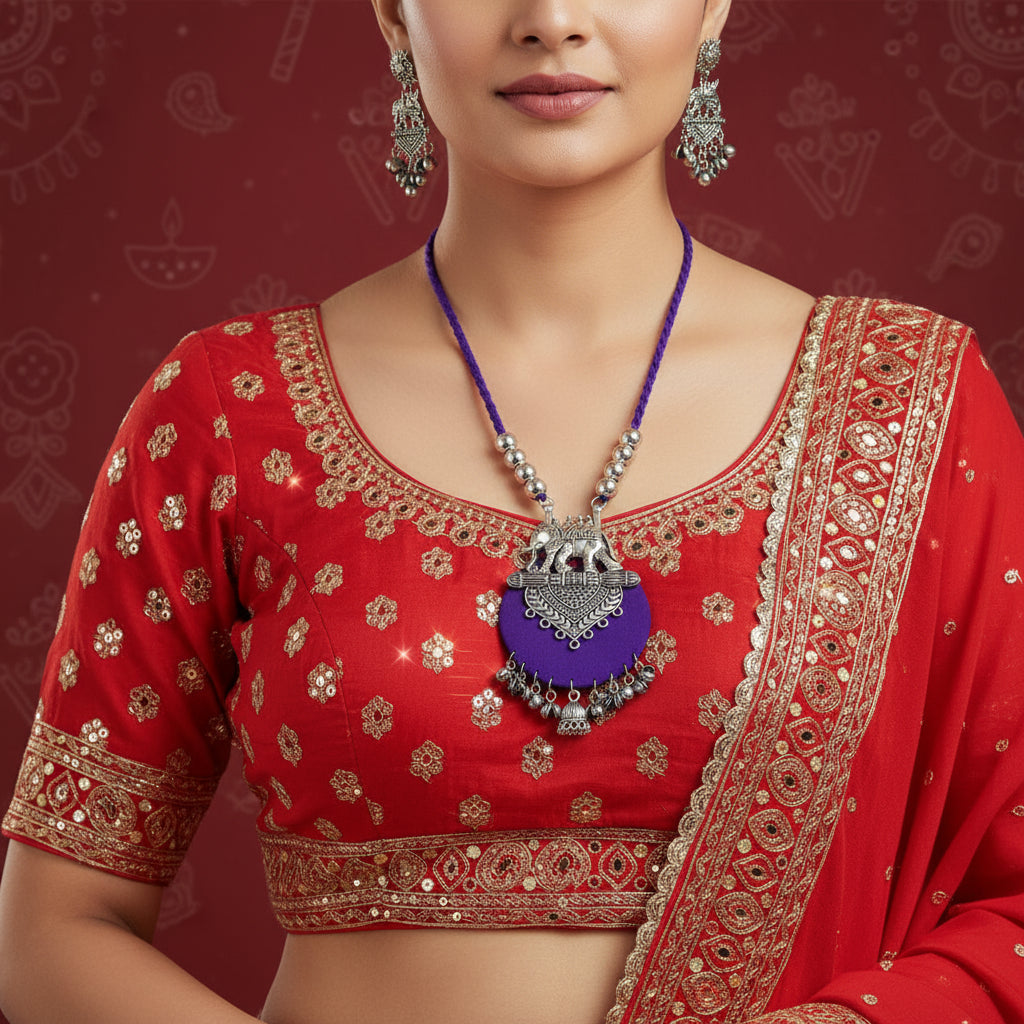 A stunning necklace featuring a detailed silver elephant pendant on a vibrant purple fabric base, adorned with matching beads, tassels, and dangling bells, blending traditional craftsmanship with elegant style.