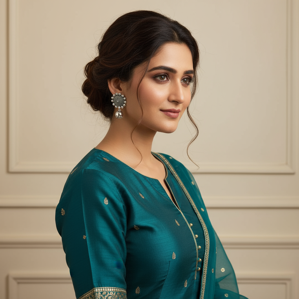 These elegant earrings feature a traditional Indian jhumka design crafted from oxidized silver. The circular tops are intricately detailed with concentric patterns and adorned with small spherical accents around the edges. Each earring is complemented by a dangling polished silver ball, decorated with a delicate floral base, adding a touch of sophistication and cultural charm. Perfect for enhancing traditional or fusion outfits.